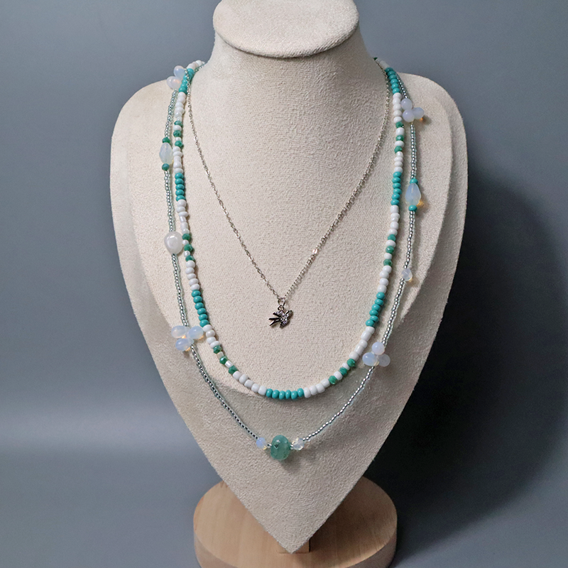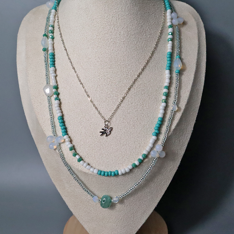 Sommerliche Kette aus verschiedenen Edelsteinen, Glasperlen mit einer Silberkette dekoriert, für jede Frau, die Eleganz und Stil in den Details findet.