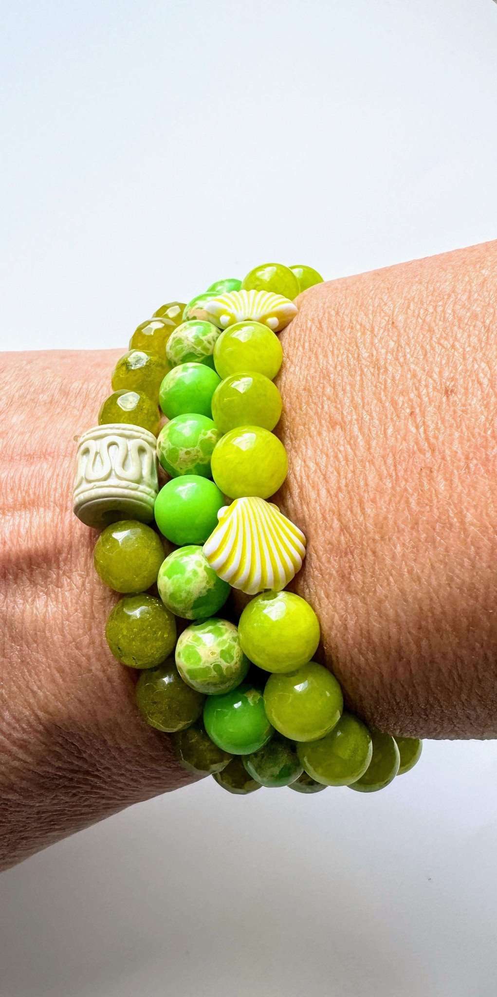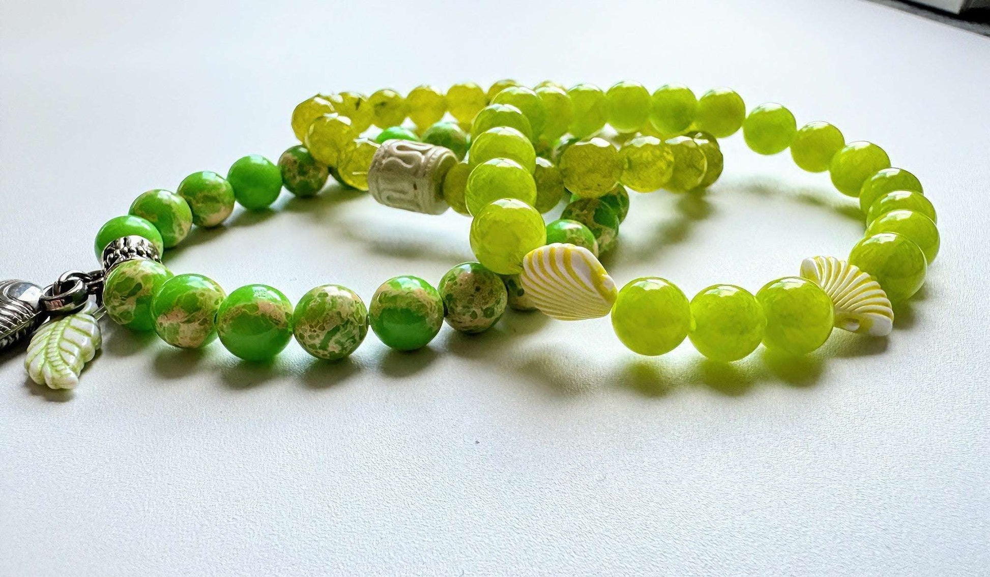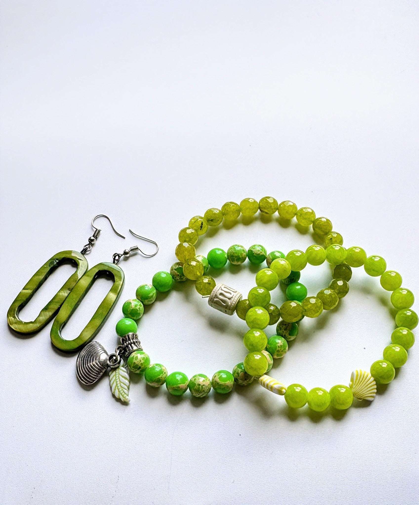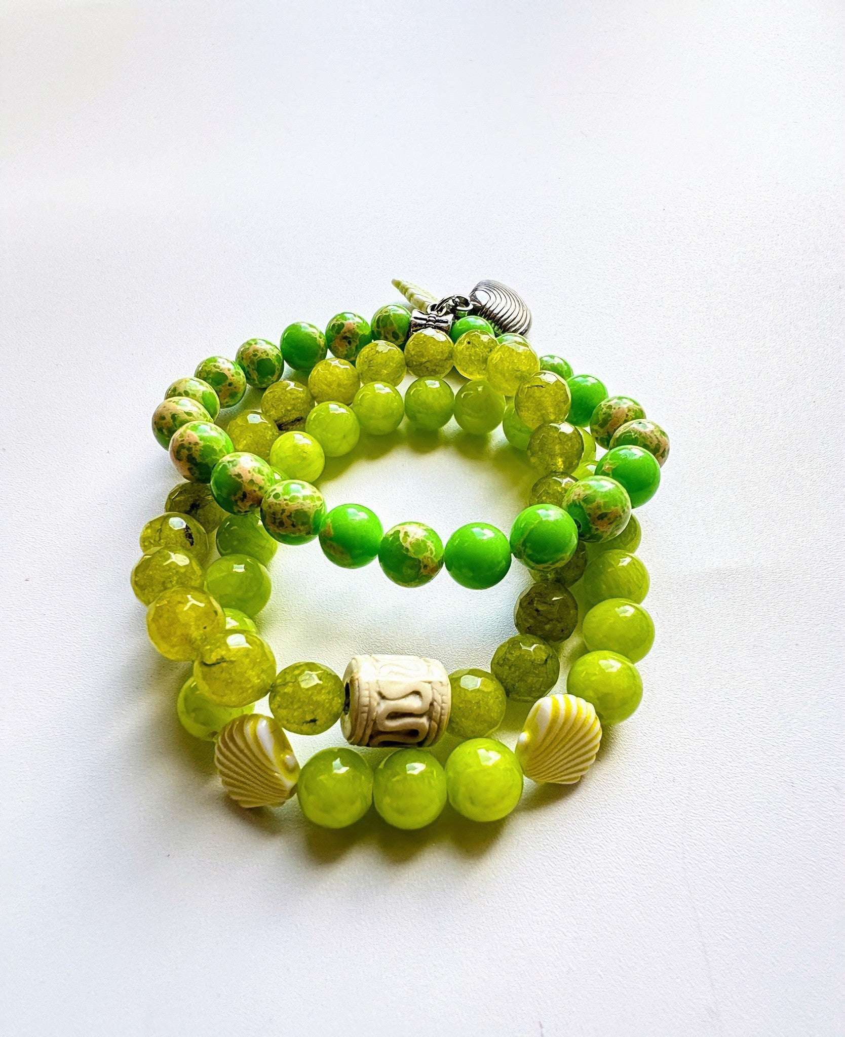 Sommerliche 3 Stretcharmbänder aus Limettegrün Serpentin und Gaspeit Perlen mit kleinen Anhängern kombiniert. Das Armband ist lässig und leicht zu tragen.