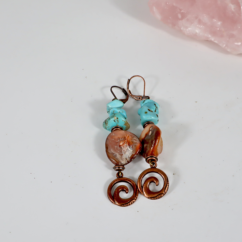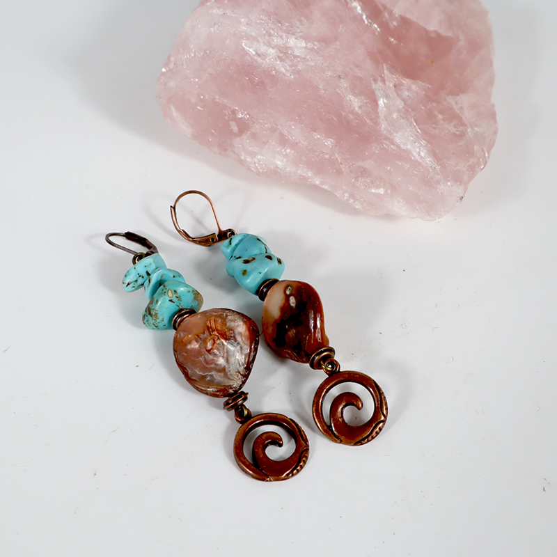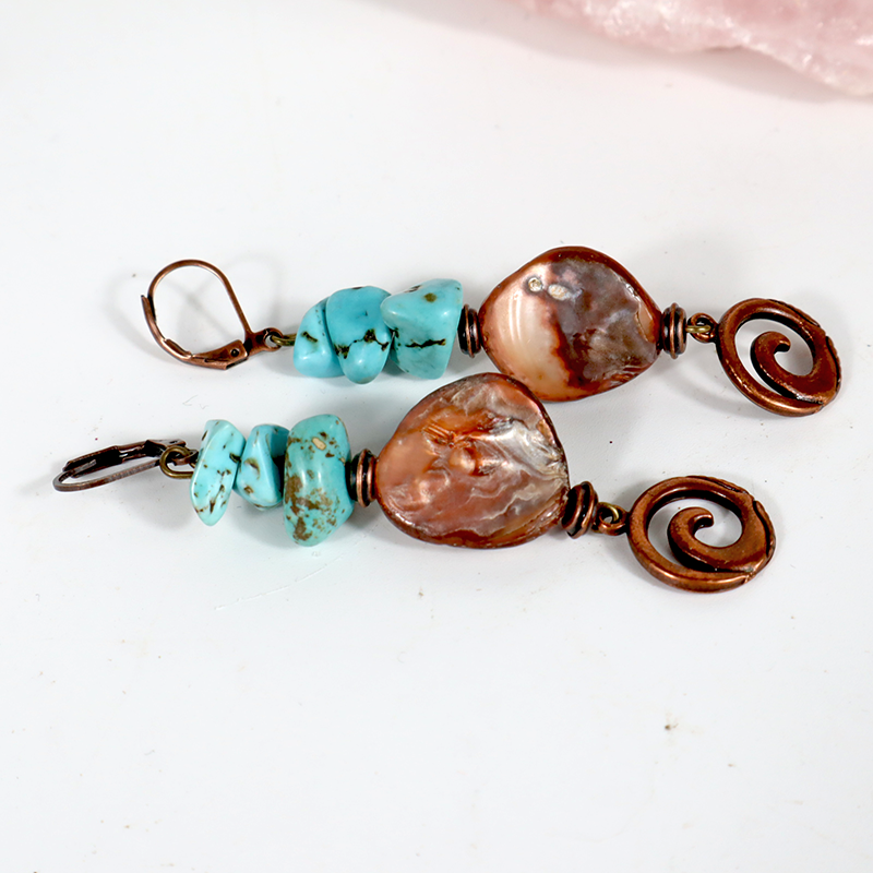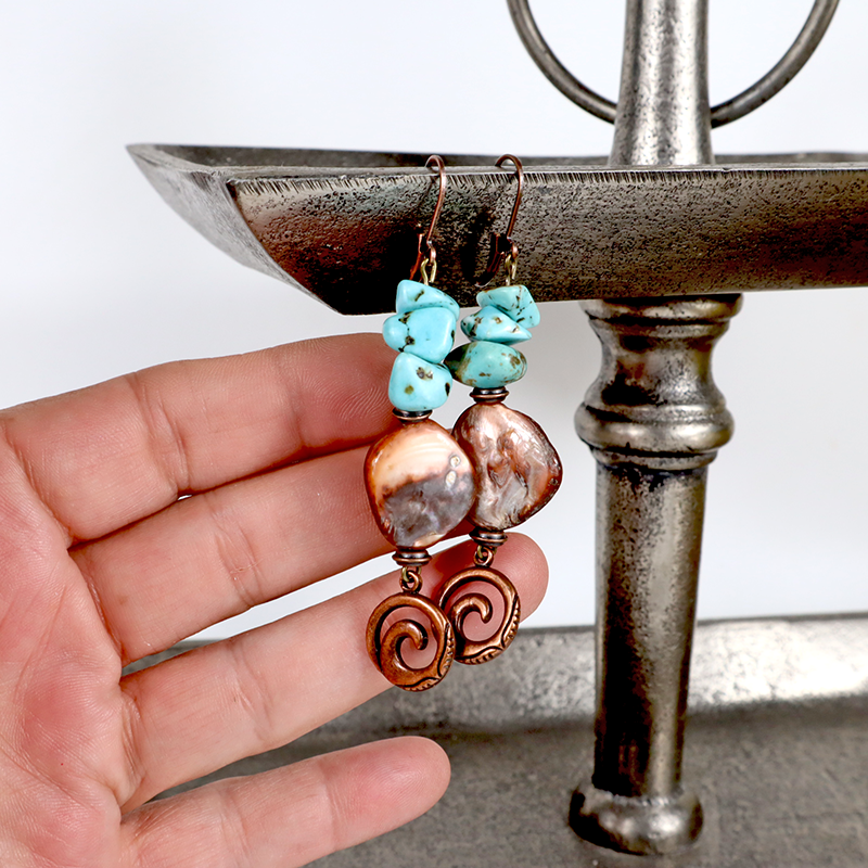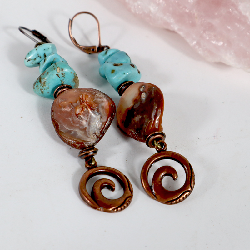 Ohrhänger aus Muschelperlen, Türkis Howlith und handgefertigten Kupfer Anhänger.