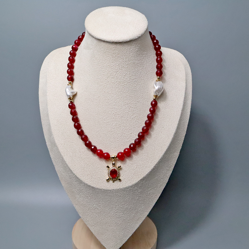 Wunderschöne elegante Halskette aus Rubin, mit zwei großen Perlen und einem vergoldetem Schildkröte-Zirkonia Anhänger kombiniert.