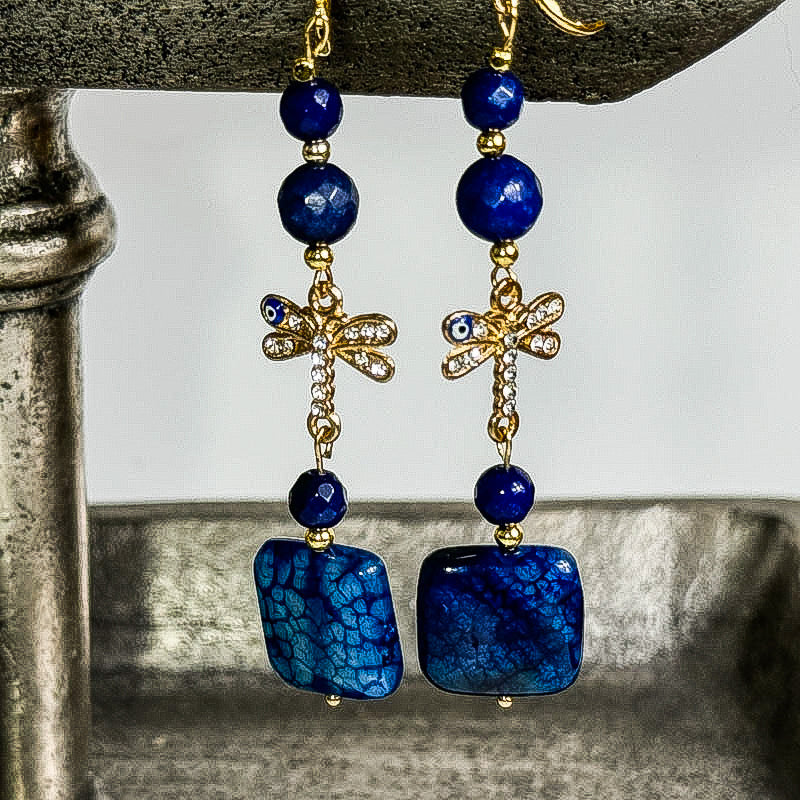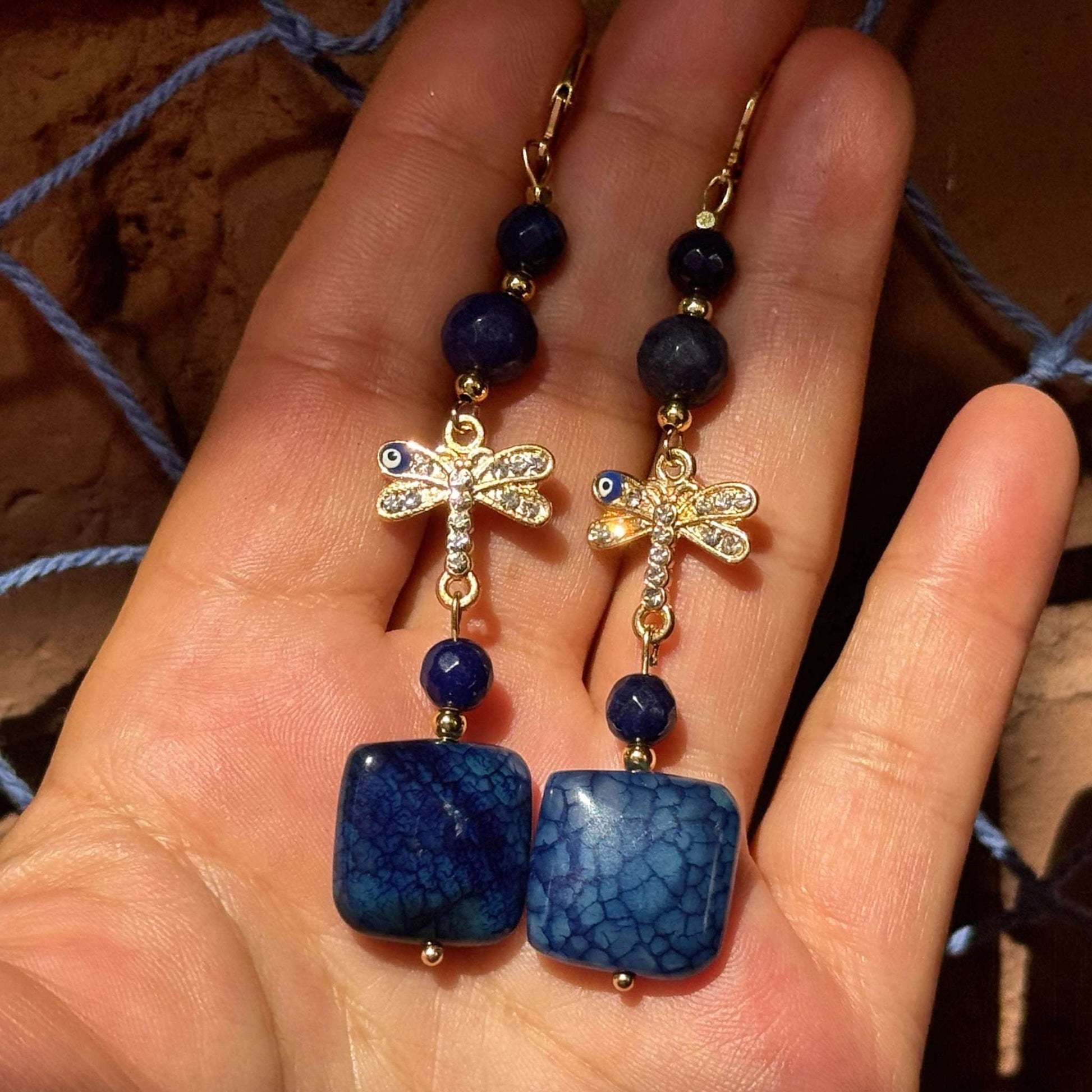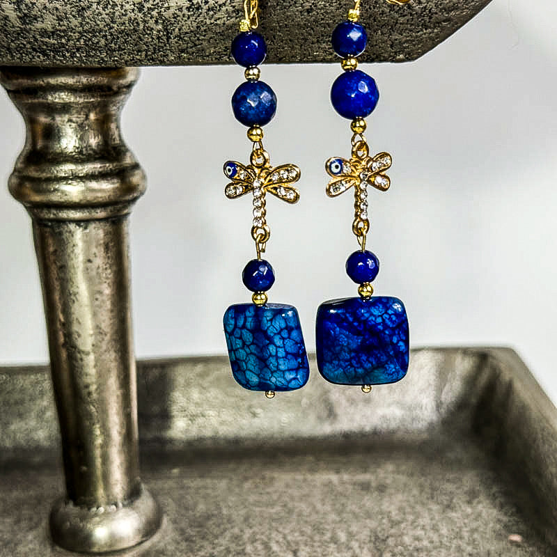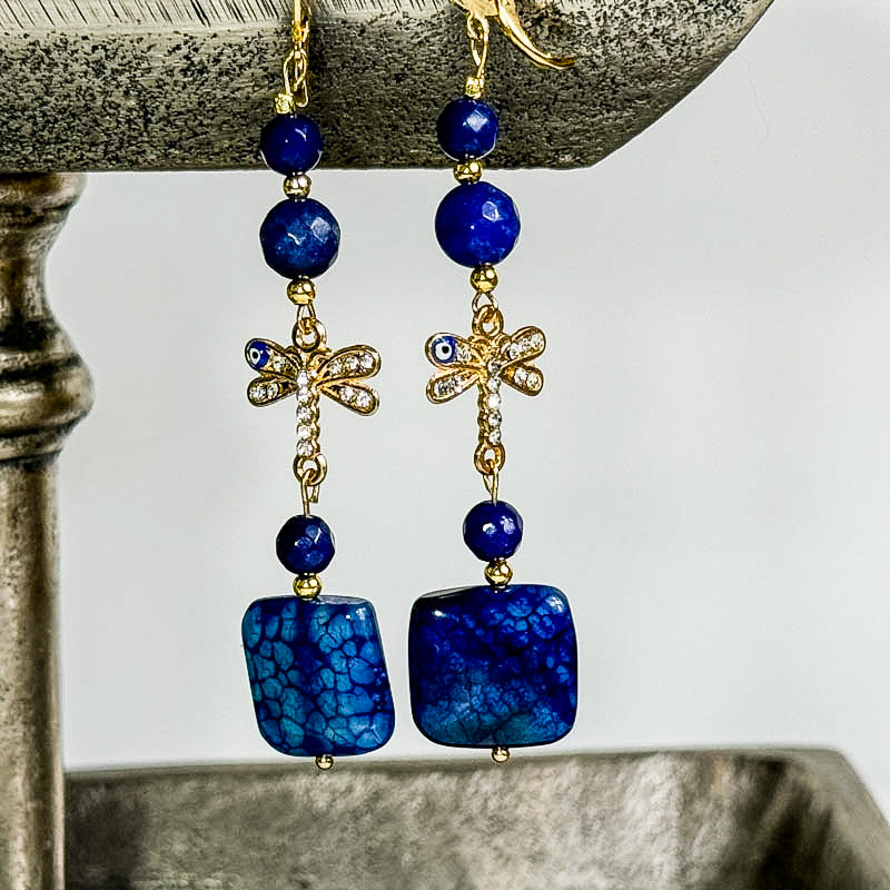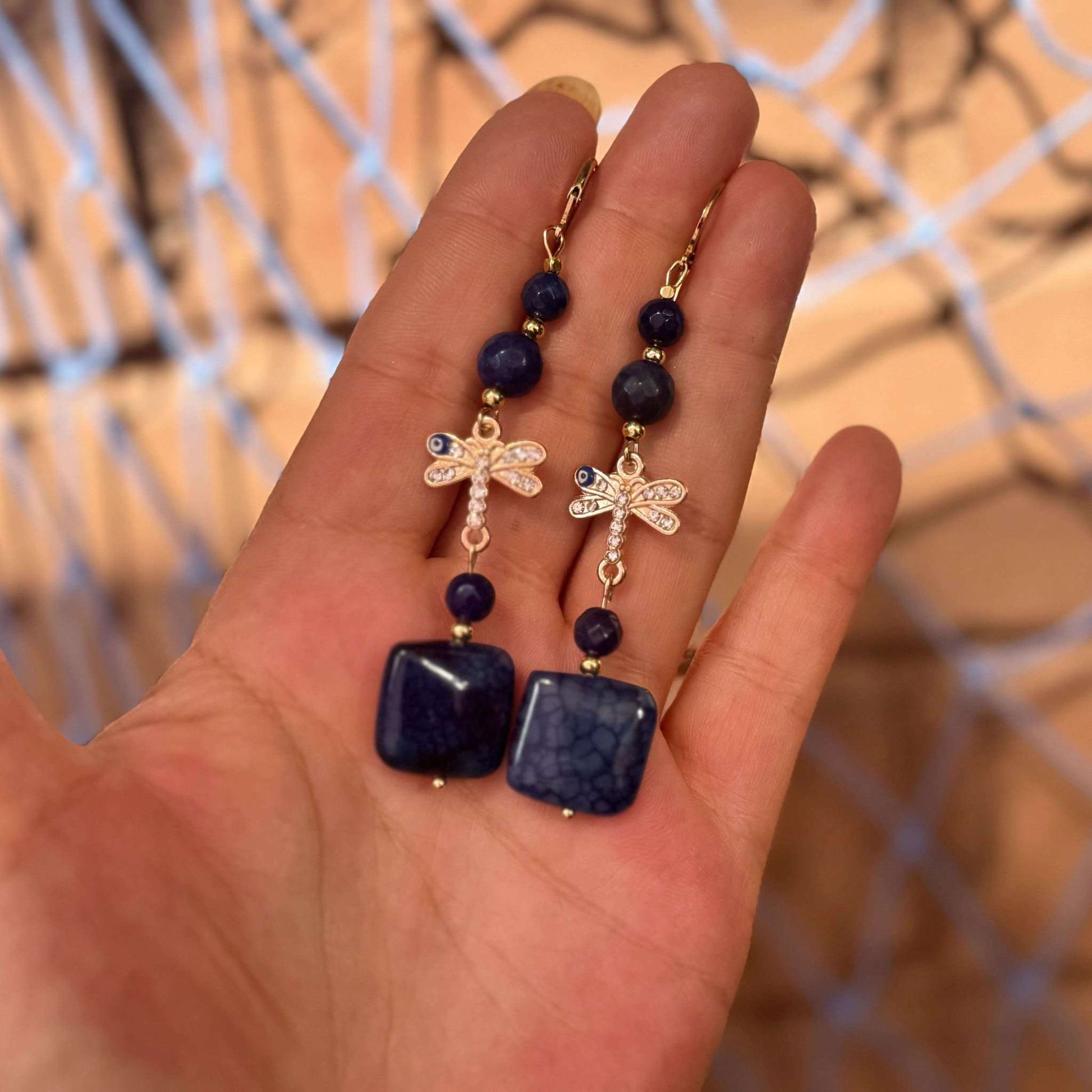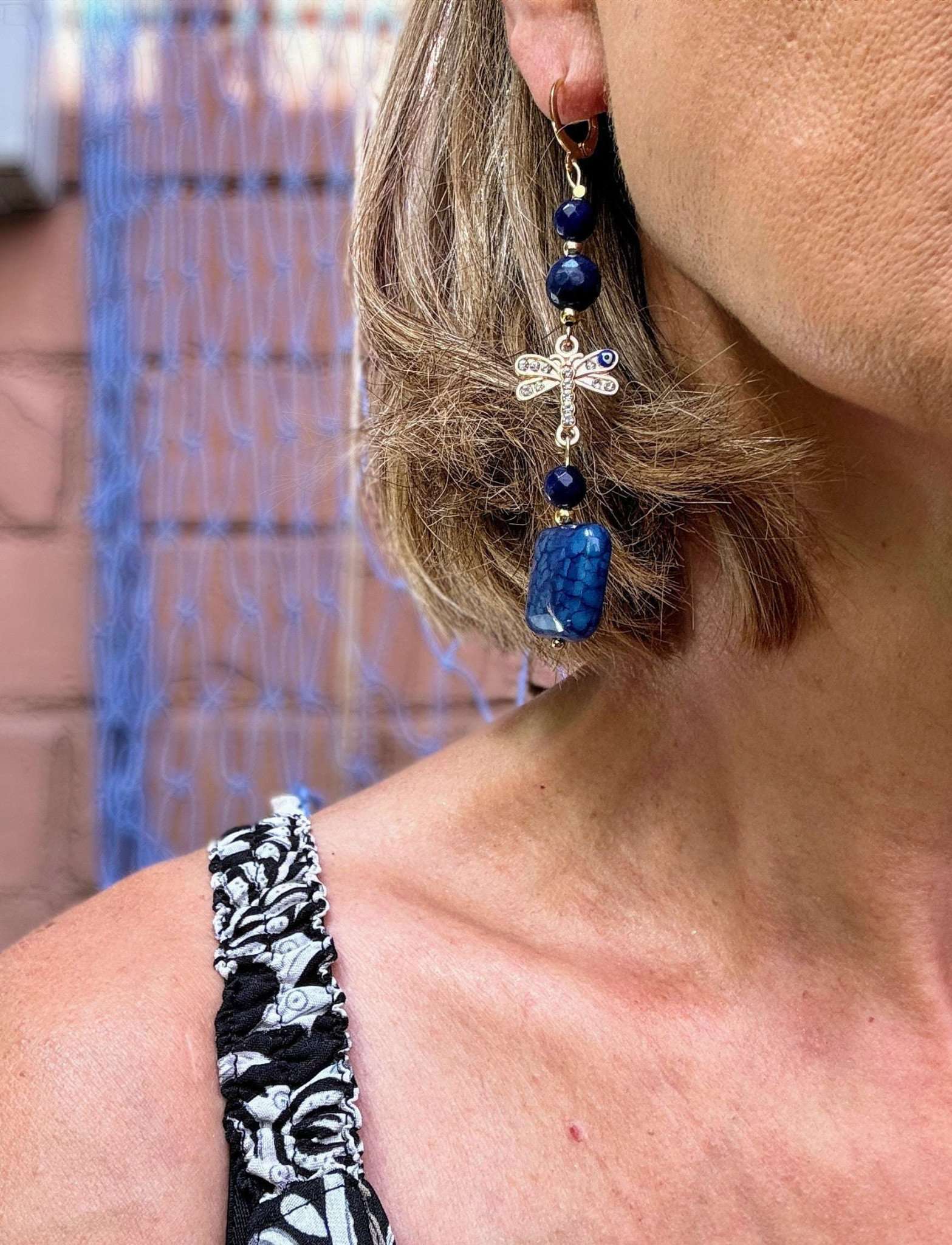 Elegante Kobaltblau- Ohrringe aus natürlichen Saphirperlen, Jade und Zirkonia Zwischenperlen kombiniert.